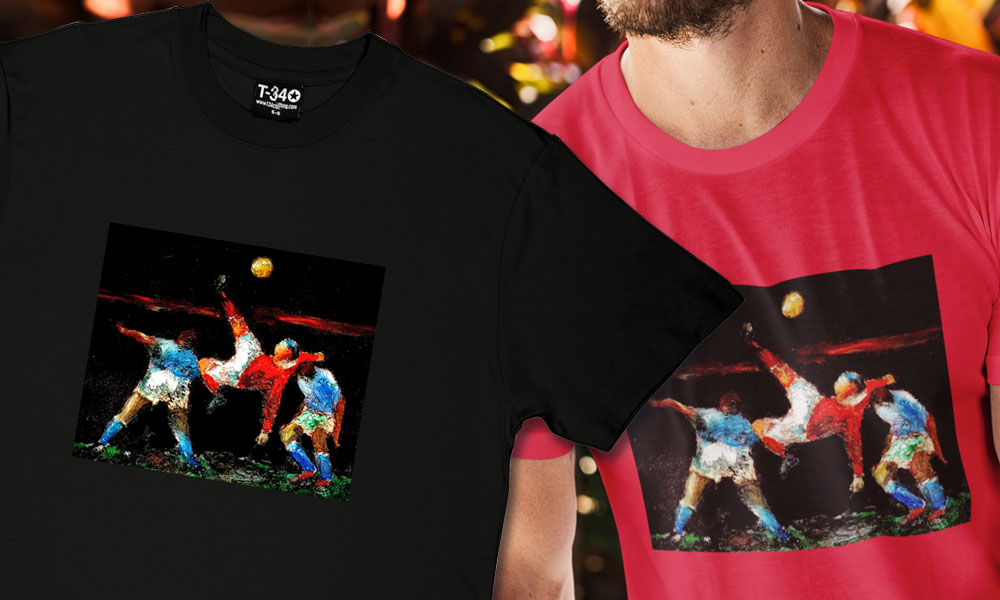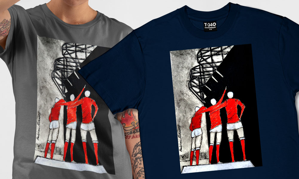 We are very pleased to be able to announce that we are now producing a range of products based on the works of Manchester artist Hadrian Richards. Hadrian is a painter, printmaker and graphic designer. His studio is based in Manchester although his works are exhibited far and wide in numerous gallery spaces. Working mainly in oils at the outset his work is representational or semi-abstract. We have four of his excellent artworks referencing Manchester United available on both t-shirts and mugs.