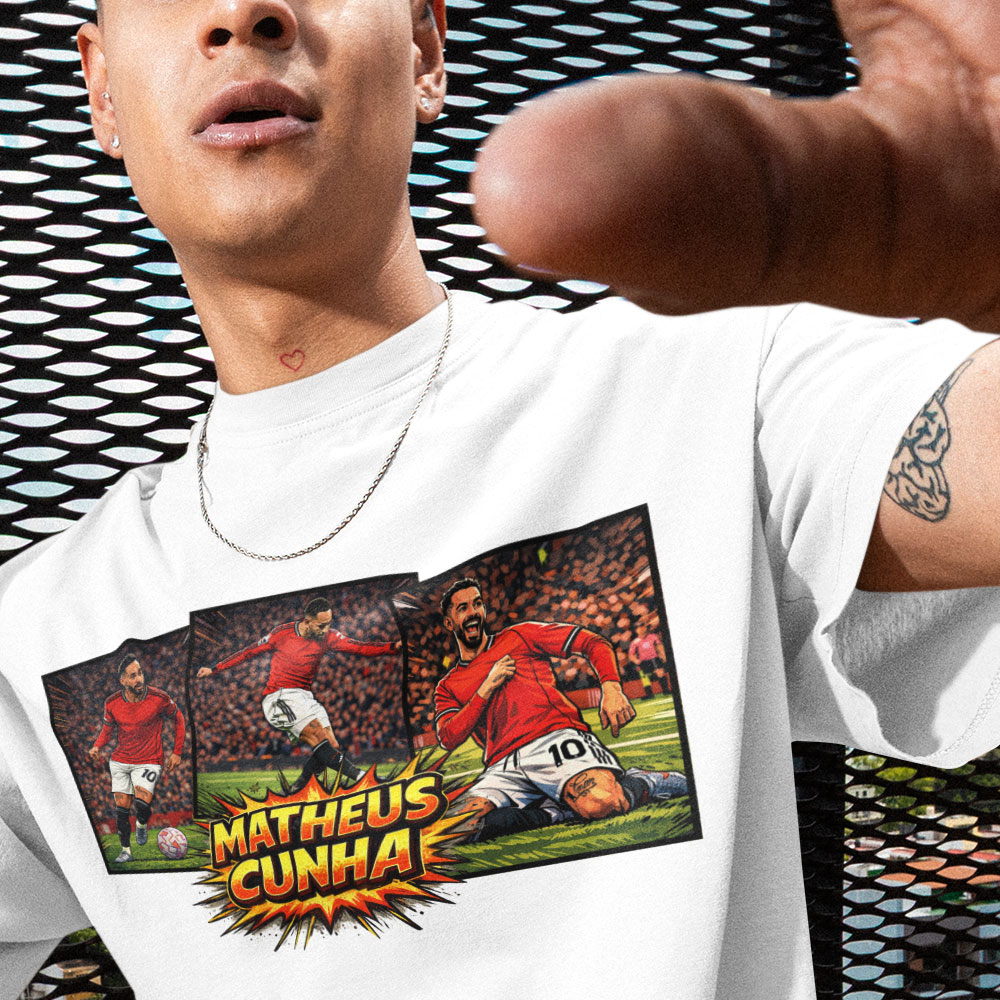 He dribbles... He shoots... He scores! He celebrates. A comic book-style depiction of United's Brazilian number ten, Matheus Cunha.